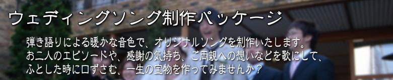 ■仕上がり例 共通点 (歌詞) ■楽曲制作の流れ @メールによる打ち合わせ 【楽曲制作受付フォーム】より必要事項をご入力の上、ご送信ください。 お見積もりも無料で致します。 お客様のイメージする歌詞や曲調を伺い、それを基に作詞・作曲をします。 歌詞は日記調、箇条書きなどで構いませんので、可能な限り詳しくお伝えください。 曲のイメージは明るい感じ・落ち着いた感じ・アップテンポ・スローテンポなどでお伝えください。 文章で伝えにくい場合や、お急ぎの方は電話でのご相談も承ります。 演奏は基本的にギターでの弾き語りになります。 A制作開始 始めに、いただいたイメージからデモソングを制作いたします。 デモソングを確認していただき、お客様のイメージとかけ離れているようでしたら、 メールでやりとりしながらデモを作り直します。 制作完了までの期間につきましては基本的には歌詞のもとになるものをいただいてから1ヶ月以内となります。 デモソングの試聴&修正は10回までとさせていただきます。 B完成・納品 CD-Rもしくはメールに添付して納品いたします。 メールでの納品の方は、PCのメールアドレスをご用意ください。 C郵便・銀行振り込み(後払い制) 納品後、当方の口座にお振込ください。 口座番号は制作完了後にお知らせいたします。振込時の手数料はご負担ください。 基本的にインターネットでのやり取りになりますので、 トラブルを避けるため、またお客様の安心のために後払い方式で制作させていただいております。 ![]() ●Q:どんなことを歌詞にしたらいいの? ●A:結婚式ソングの場合の例 ○お相手に対する手紙。 ○お二人の馴れ初め。どうやって知り合い、どのようにして付き合うようになったのか。 ○お二人の中で印象に残った出来事。またその中でも特に印象に残った出来事。 ○お相手に対しての気持ちや想い。(例:幸せだよ 愛してるよなど) ○これからどうなったら素敵だなとおもうのか。 ○どんなケンカをして、どうやって仲直りしたのか。 ○お二人で行った特別な場所はどこで、どんな思い出があるのか。 ○お相手に出逢う前の自分はどのような感じで、出逢ってから自分はどう変わったのか ○親御様への想いでも構いません (これらを書いて、そのままご依頼フォームに送信してくださっても構いません) ■追加サービス一覧